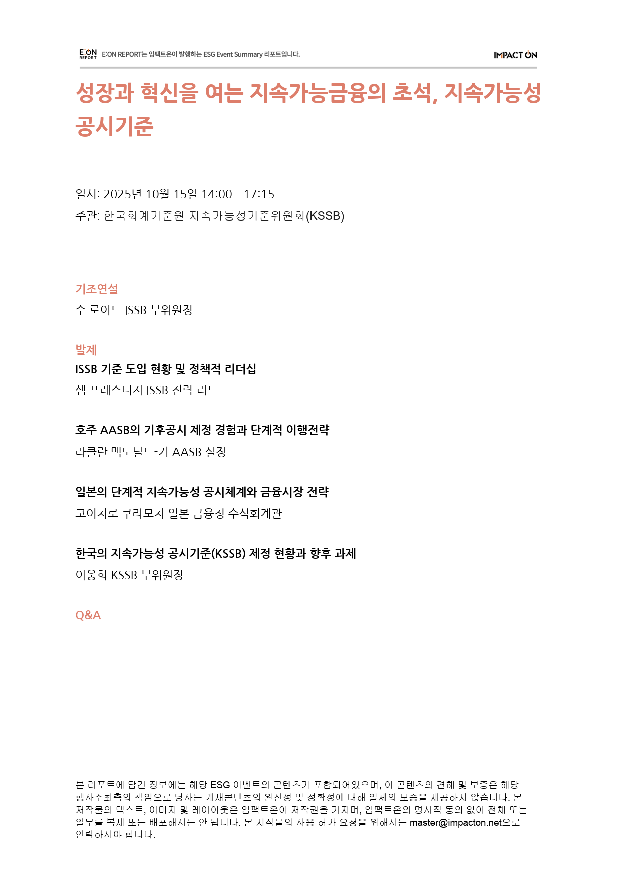성장과 혁신을 여는 지속가능금융의 초석, 지속가능성 공시기준 - 10월