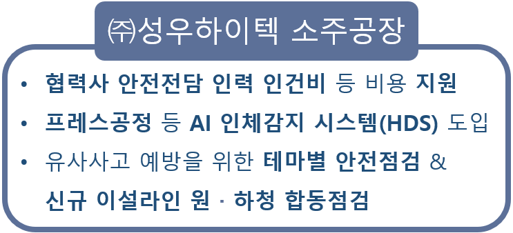 ㈜성우하이텍 소주공장은 협력업체 안전 전담 인력 인건비 등 안전보건 관리 비용을 지원하고, 프레스 공정에 인공지능(AI) 인체감지 시스템(HDS)을 도입했다. 신규 이설라인 원·하청 합동 점검을 통해 협력업체 구성원이 안전 활동의 주체가 되는 문화를 만들어가고 있다.