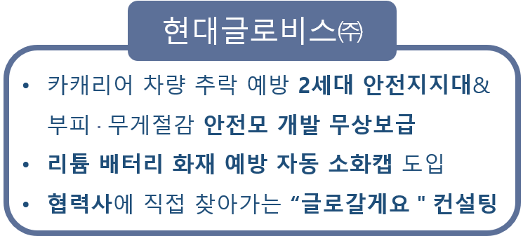 현대글로비스㈜는 협력업체 운전원 의견을 반영해 경량 안전모를 보급하고, 작업공간을 넓힌 2세대 안전지지대를 무상 지원해 추락 위험을 예방했다. 리튬 배터리 보관 구역에 열화상 카메라와 자동 소화 설비를 설치하고, 냉난방이 어려운 현장에 에코팬, 기화냉각 쿨팬을 도입하는 데에도 투자를 아끼지 않았다.