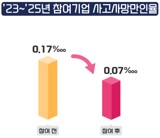 대기업과 정부의 지원을 받은 사업장은 안전한 일터로 거듭나고 있다. 지난 3년간 사업에 참여한 기업 10,453곳의 평균 사고사망만인율은 0.07‱로 참여 이전(0.17‱)보다 절반 이하로 감소했다.